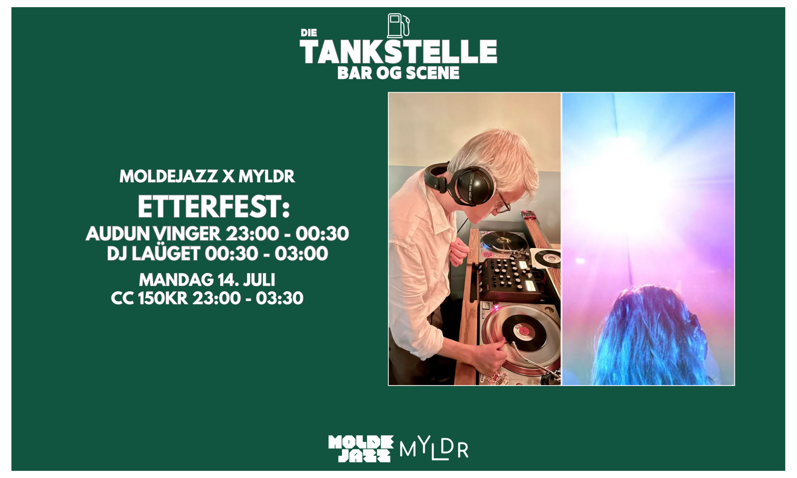 Under Moldejazz 2025 har vi skapt et spennende samarbeid mellom Moldejazz og Myldr på byens nye sted med stor D – Die Tankstelle! Her blir det DJs hver kveld fra 23.00 til 03.00, og ikke hvilke som helst DJs. Vi har håndkurert noe av det kuleste som finnes akkurat nå, basert på festivalens program, og tanken er at Die Tankstelle skal være en naturlig forlengelse av Moldejazz-festen – om natta. Kapasiteten er begrenset, så kom tidlig for å danse og ha det bra med oss!